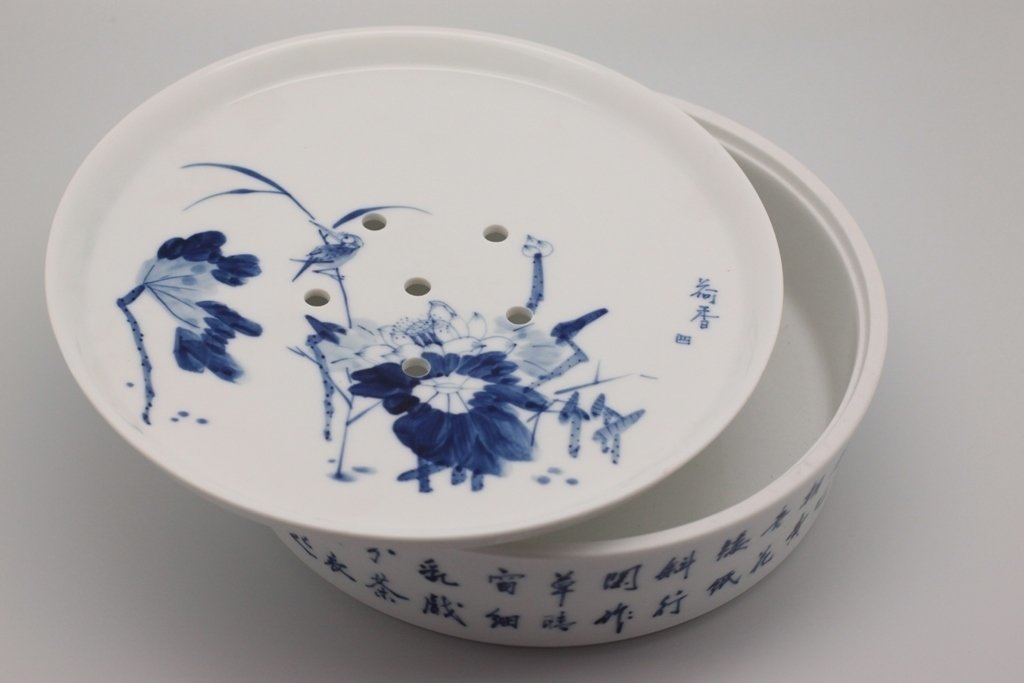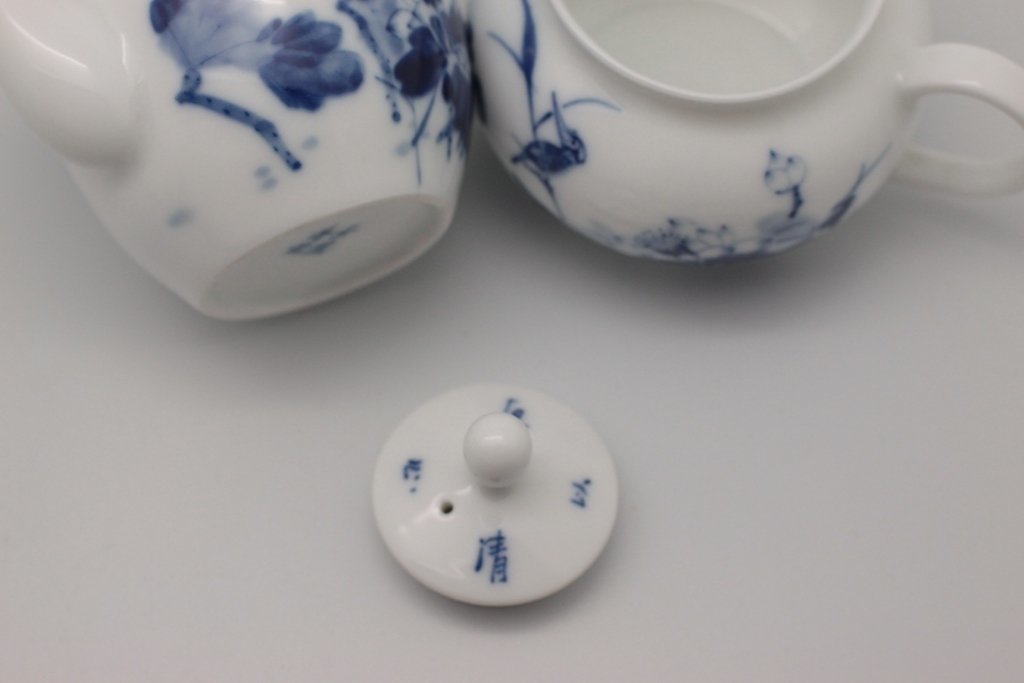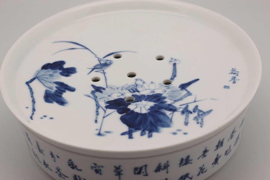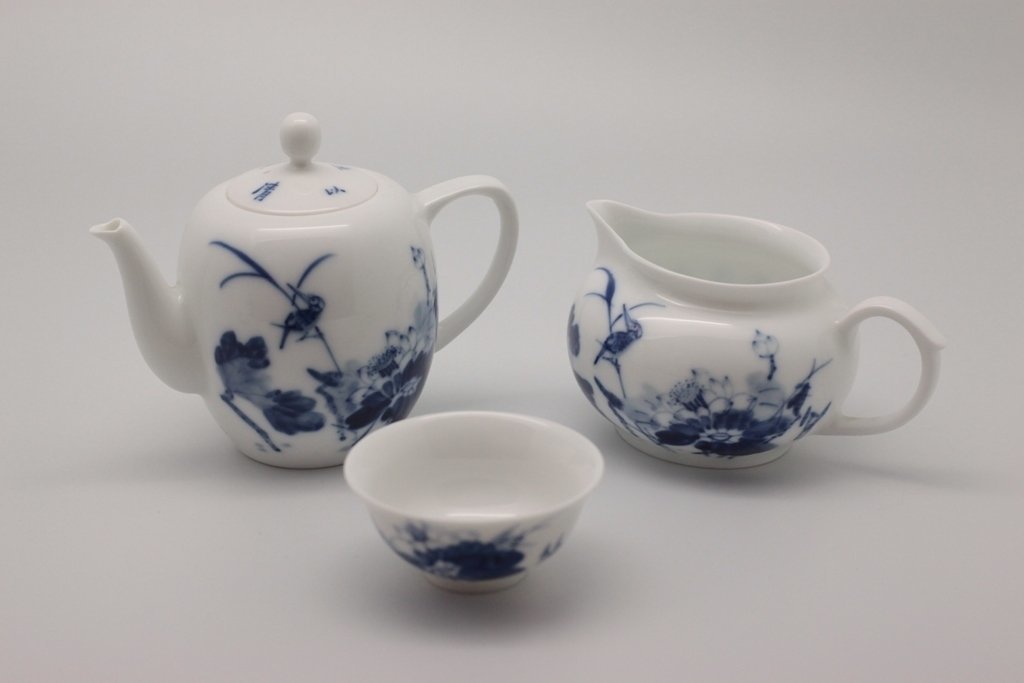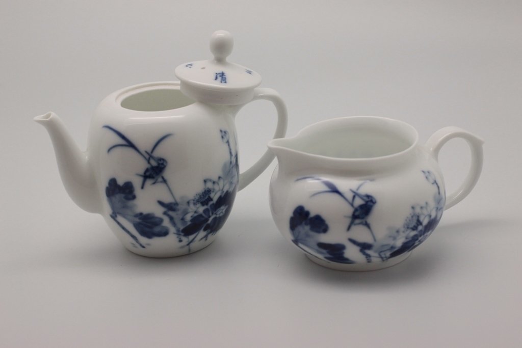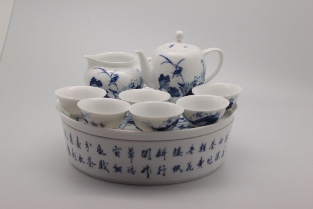 Набор из 9 предметов: чайник, чахай, чашки и чайный пруд. Удобно, что в этом наборе есть чайный пруд (чабань), в котором собирается жидкость. Его наличие избавит вас от дополнительных трат. Набор сделан из фарфора, голубая роспись. Такой набор станет отличным подарком, тем более фарфор всегда в цене.