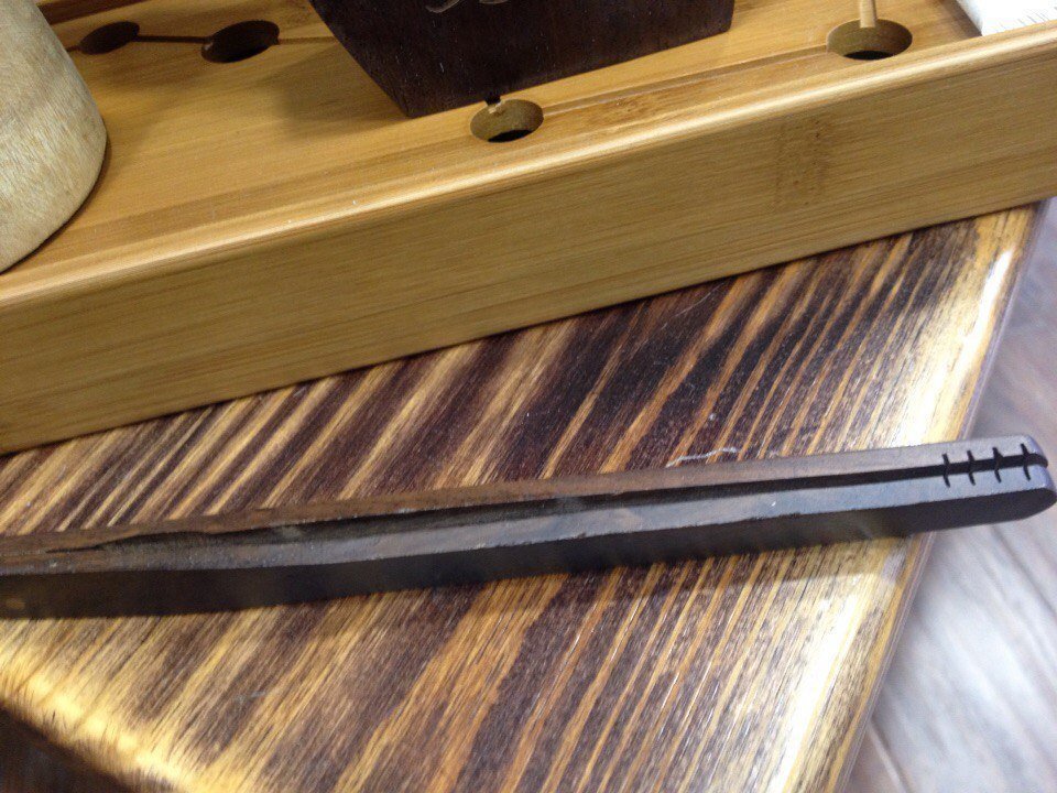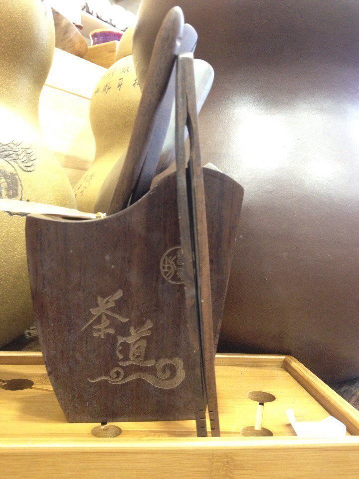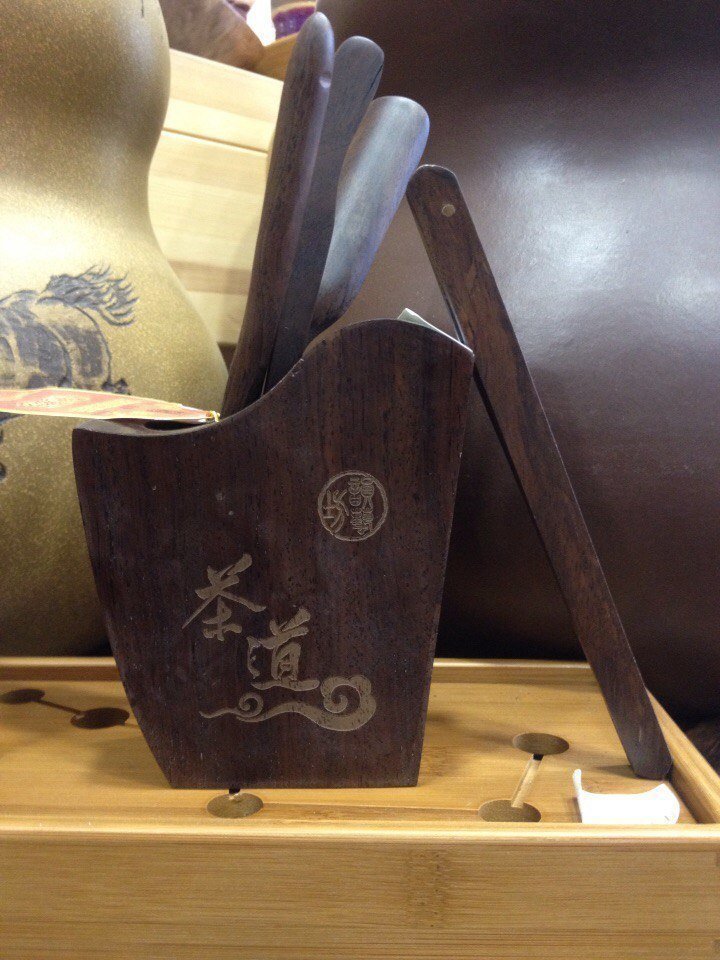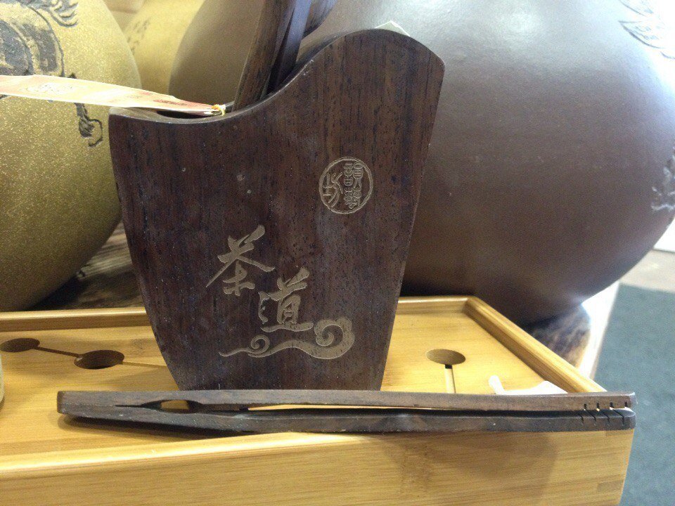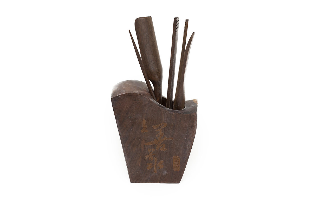 Роскошный набор чайных инструментов в подставке из цельного спила дерева. В комплекте: щипцы, лопатка для чая, совочек для чая, игла для чайника. Дефект: немного искривились щипцы. К набору легко можно подобрать другие